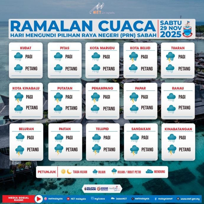根据马来西亚气象局预测,投票日几乎一整天,沙巴各地将出现不稳定天气,并伴有降雨或雷雨。