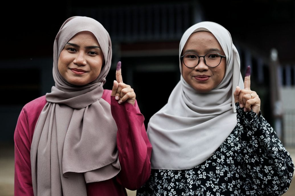 首次投票的莱夏(右)和姐姐艾茵(左)一起履行公民义务后,一起展示手指上的墨汁。(图:马新社)