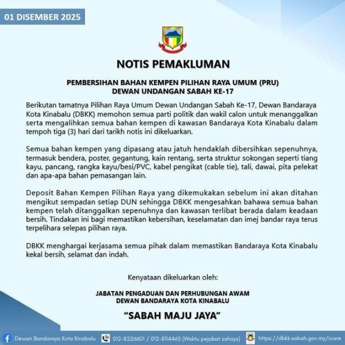 亚庇市政厅在脸书发出通知,政党与候选人务必在指定的期限内拆除亚庇范围内的所有竞选宣传材料。