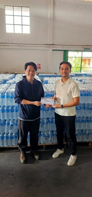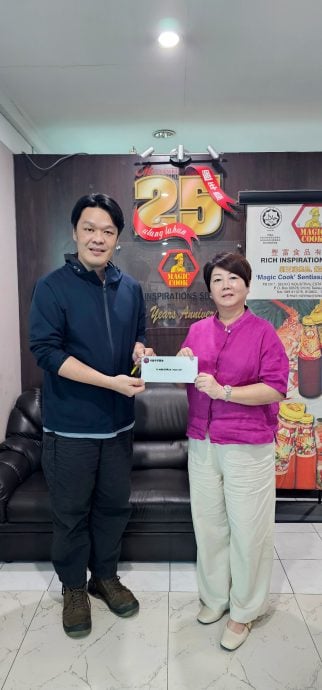 陈文廉(左)递交赞助邀请函予丰富食品有限公司董事经理陈映雪(右)。