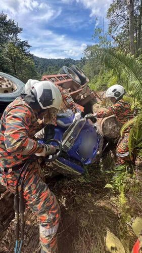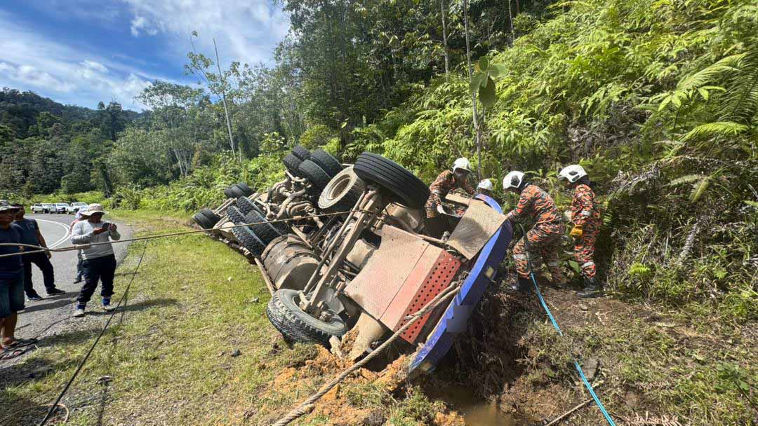 (斗湖3日讯)一辆载满木桐的拖格罗里不知何故翻向路旁沟渠,导致司机夹困在车内,当场身亡。