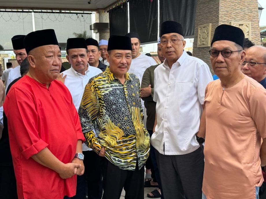 哈芝芝(左二)前往邦莫达住家瞻仰遗容。左为沙巴巫统秘书拿督杰菲里阿里芬,右二为沙巴巫统财政拿督斯里沙烈赛益。