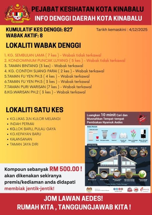 另外,沙巴州卫生局亚庇区办事处发文告,呼吁民众提高警觉,尤其是居住在高风险地区的居民,应尽速采取防蚊与防病措施,以保障自身与家人的健康。