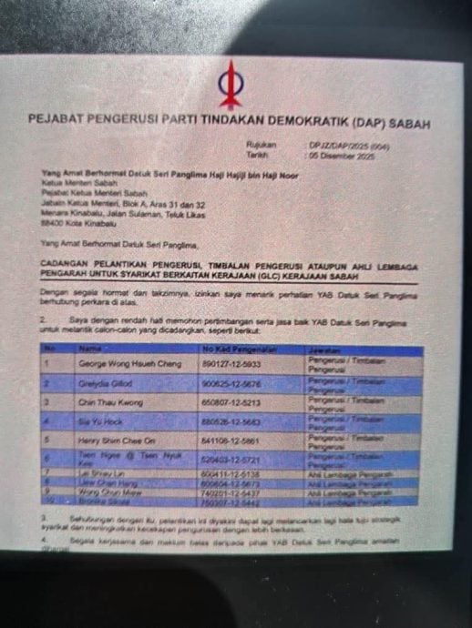 社交媒体在今日流传一封被指是沙巴行动党致予沙巴首长的信函,向州政府推荐10名党员担任官职,包括出任州官联公司主席、副主席及董事成员。