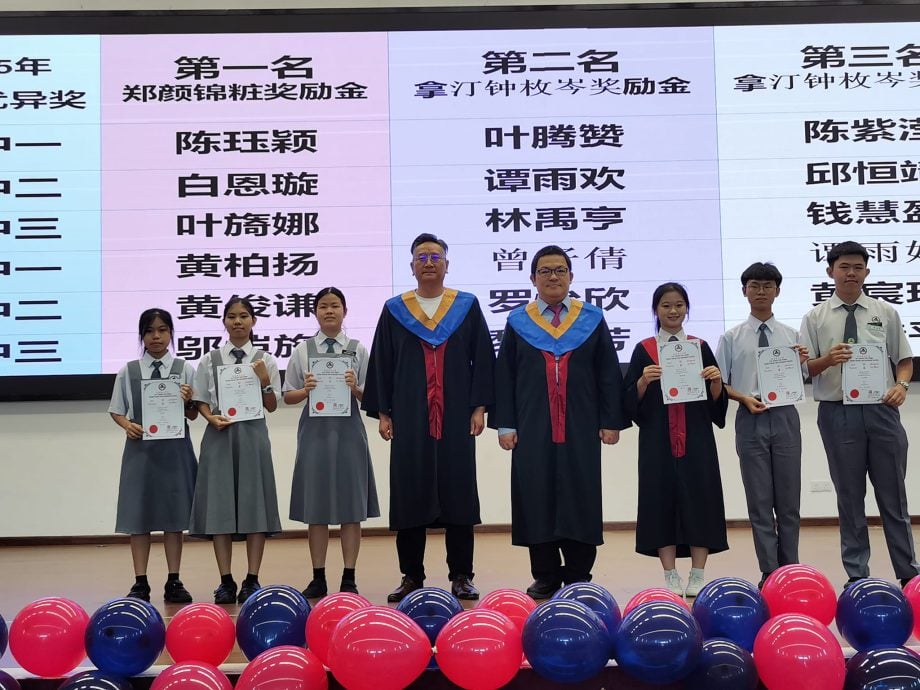 接着,由杨爱强颁发班级第三名“拿汀钟枚岑奖励金”,得奖学生为初一班陈紫滢、初二班邱恒靖、初三班钱慧盈、高一班谭雨婳、高二班黄宸玲、高三班黄皓平。