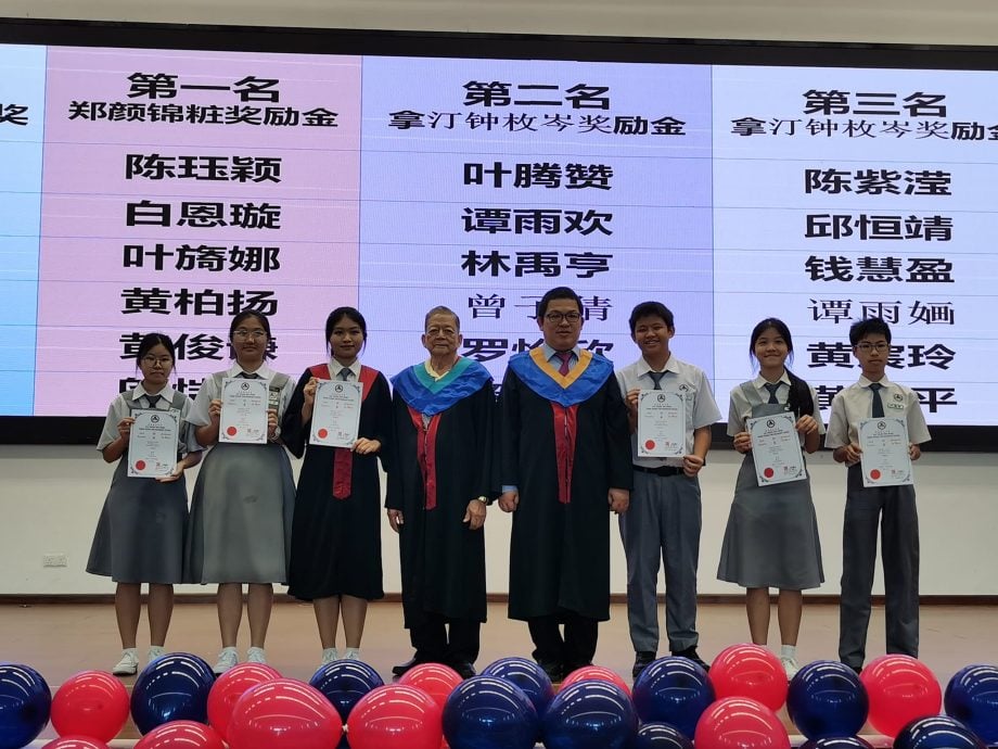 随后,神山基金信托董事,亦是该校永久名誉顾问徐伟良颁发“拿汀钟枚岑奖励金”予班级第二名,得奖学生为初一班叶腾赞、初二班谭雨欢、初三班林禹亨、高一班曾子倩、高二班罗怡欣、高三班黎慧芳。
