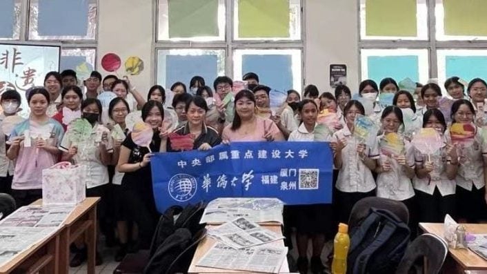 (亚庇2日讯)华侨大学社会实践团队“逐梦海丝-漆彩海丝情”团队8月1日前往亚庇建国中学开展一场别开生面的漆扇体验活动,吸引约50名师生热情参与,共同感受中国传统大漆文化的独特魅力。