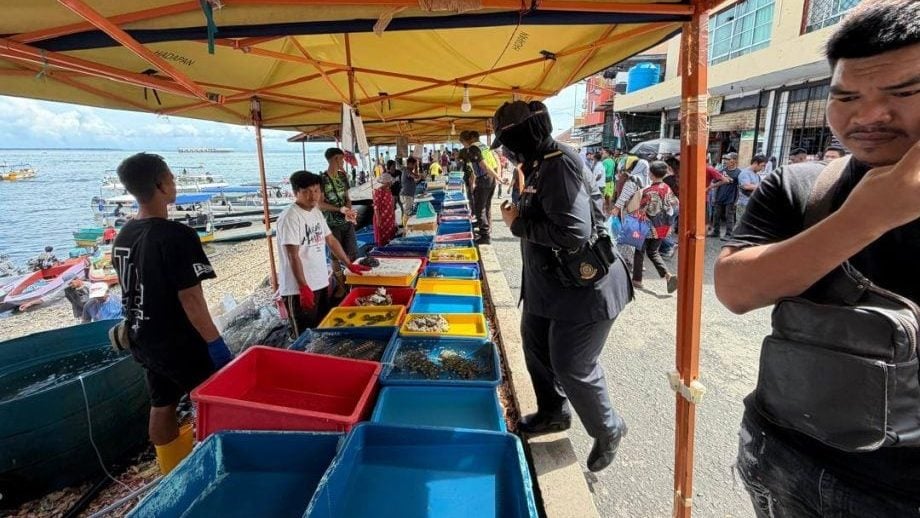 中国游客在仙本那海鲜市场遭遇“龙虾调包”事件,仙本那贸消部分局联同地方政府执法组前往市场展开检查,共取缔3名未标示价格的龙虾商贩。