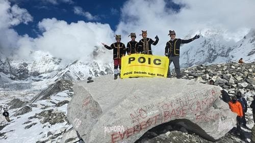 (亚庇17日讯)4名来自吧巴的登山者在尼泊尔珠穆朗玛峰营地附近,戴上嘉达山杜顺族传统头饰“Sigah”,并穿上传统服装,象征“沙巴精神”在喜马拉雅山脉高扬!