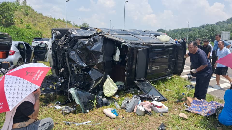 (古晋26日讯)一辆载有8人的客货车与一辆四驱车猛撞,导致客货车内2人重伤并当场丧命,同行6人受伤。四驱车内一对男女及孩童3人也受伤。 交通意外于今日中午在木中县一间诊所附近路段发生。双方9名伤者较后被送往当地医院治疗。 据悉,四驱车与客货车猛撞后均侧翻路上,四驱车车头及车顶严重损毁,客货车车头等也毁坏不堪。当地警方人员闻讯后前往现场展开调查工作。