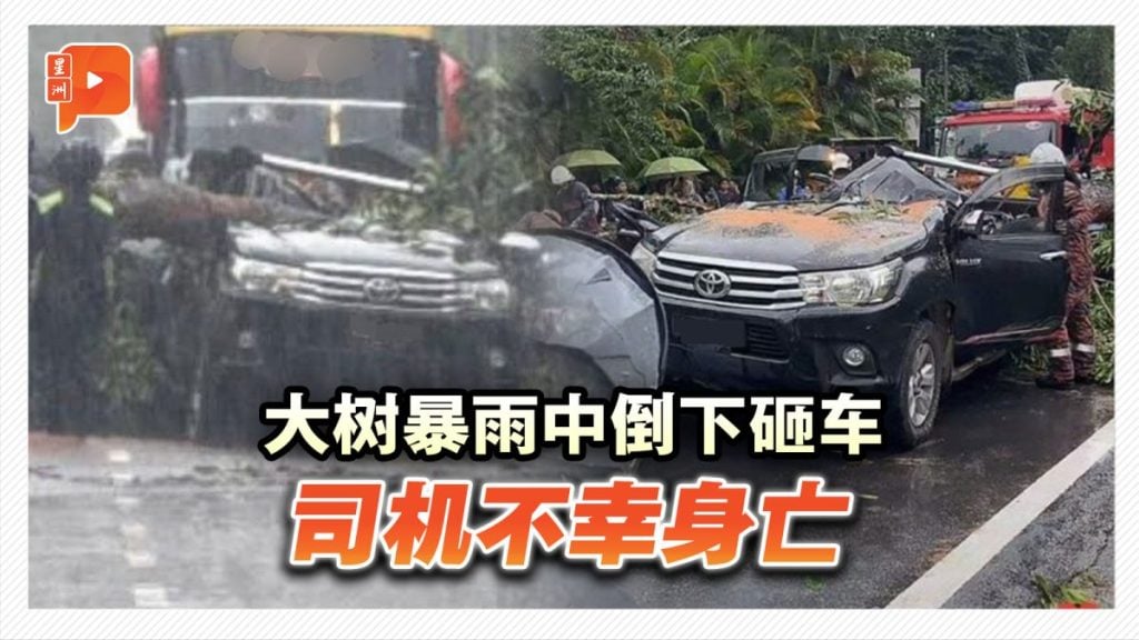 暴雨中,一辆行驶中的四驱车遭倒树压毁,司机当场罹难,目击者拍下怵目惊心画面。