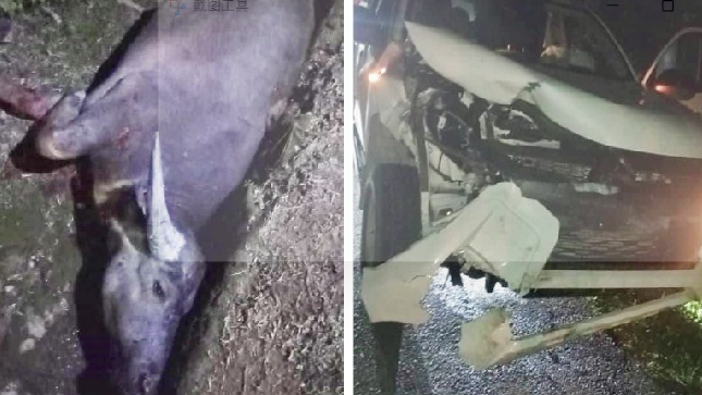 百乐县又有涉及牛只的马路意外!四驱车司机在夜间行驶时撞及一头从旁边冲出路面的水牛,司机因此受伤,水牛则被公众宰杀了。