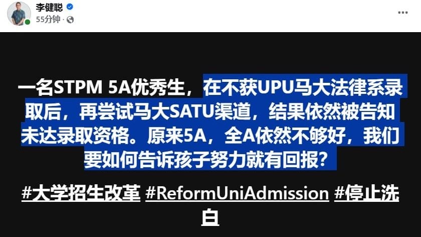 STPM 5A也进不了?优秀生两度通过不同管道申请马大法律系遭拒,令八打灵再也区国会议员李健聪无奈叹“5A、全A还不够好?”