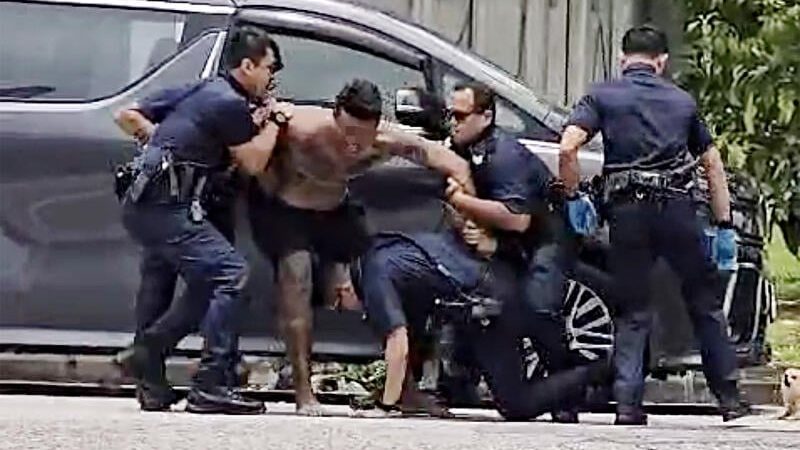 (新加坡21日讯)壮硕男神情恍惚躺在路面,惊动警方到场,经查证后发现对方是通缉犯,不仅挣扎拒捕,还一度袭警,甚至企图咬人,最后需出动5名警员合力制伏他。