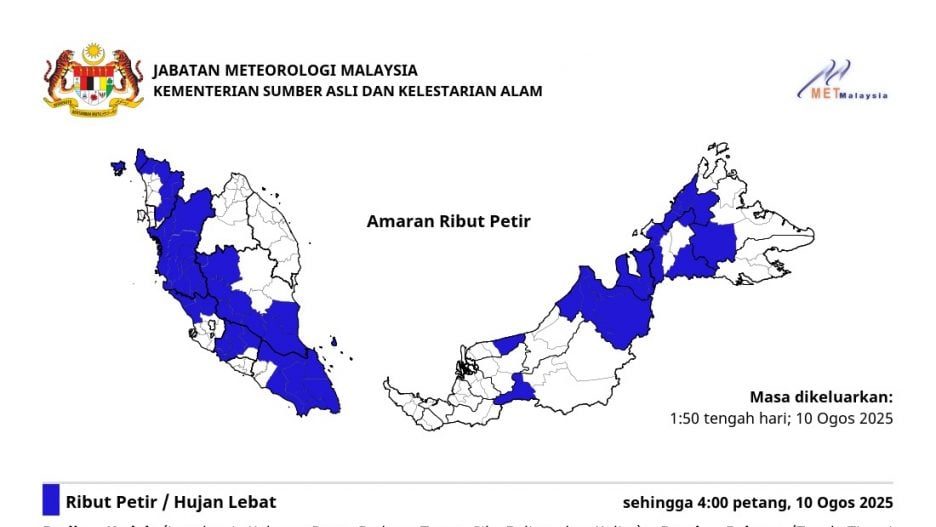 大马气象局发布雷暴预警,除了马六甲、森美兰、玻璃市,预计今日下午5时前,全马多地将出现雷雨强风!